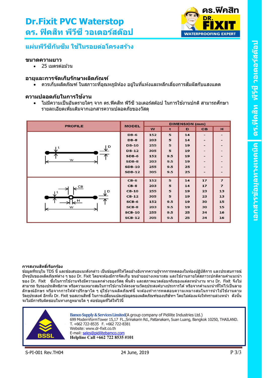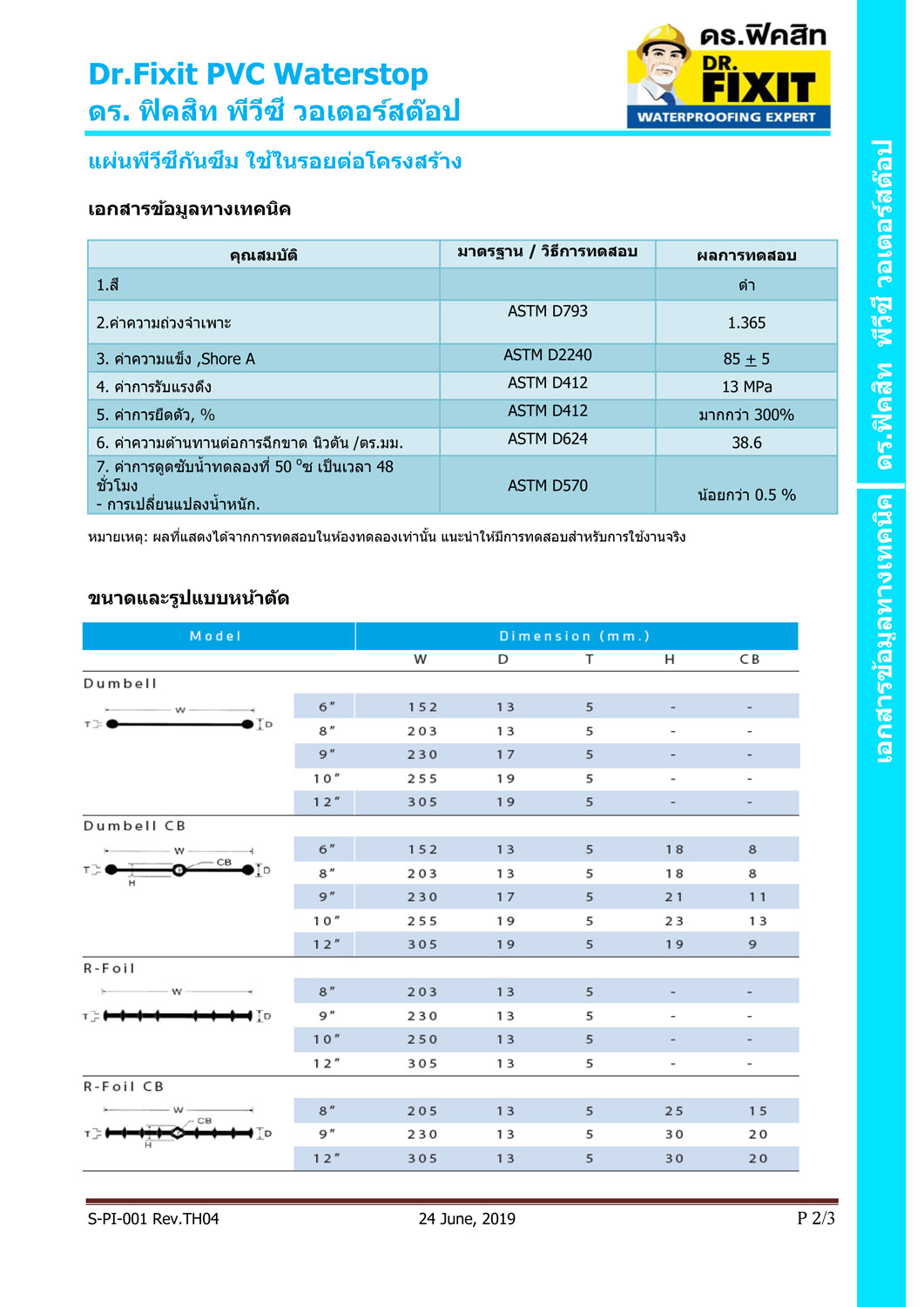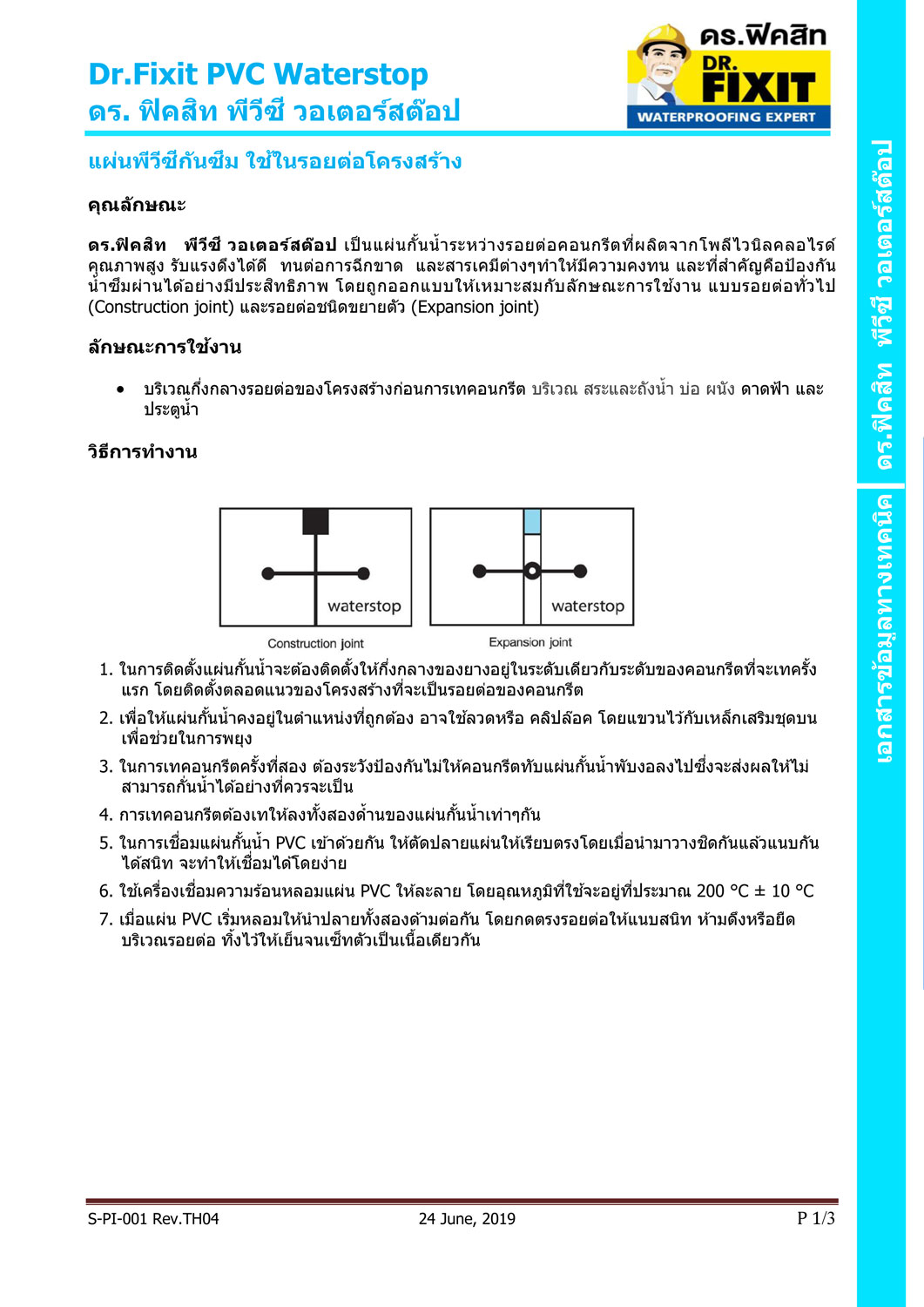 ดร.ฟิคสิท พีวีซี วอเตอร์สต๊อป เป็นแผ่นกันน้้ำระหว่างรอยต่อคอนกรีตที่ผลิตจากโพลีไวนิลคลอไรด์คุณภาพสูง ทำให้มีความคงทน และสามารถกันไม่ให้น้ำซึมผ่านได้อย่างมีประสิทธิภาพ โดยถูกออกแบบให้มีลักษณะที่มีขนาด รูปร่างหน้าตัดและความหนาต่างๆ กัน ขึ้นกับลักษณะการใช้งาน ใช้ติดตั้งในบริเวณรอยต่อโครงสร้างบริเวณที่สัมผัสน้้ำและมีโอกาสรั่วซึม สามารถใช้ได้ทั้งแบบรอยต่อทั่วไป (Construction joint) และรอยต่อชนิดขยายตัว (Expansion joint)